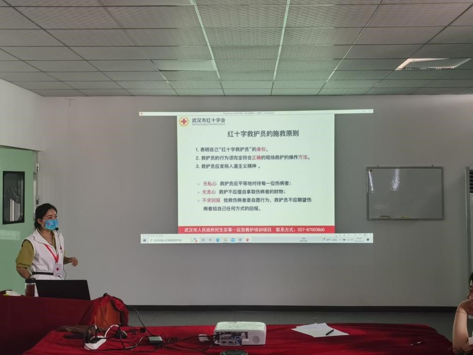 武漢市紅十字會工作人員分別采取理論講授與實際操作相結(jié)合的方式為大家講解了救護概念、心肺復(fù)蘇知識、AED使用講解、氣道異物梗阻現(xiàn)場救護等應(yīng)急救護內(nèi)容。